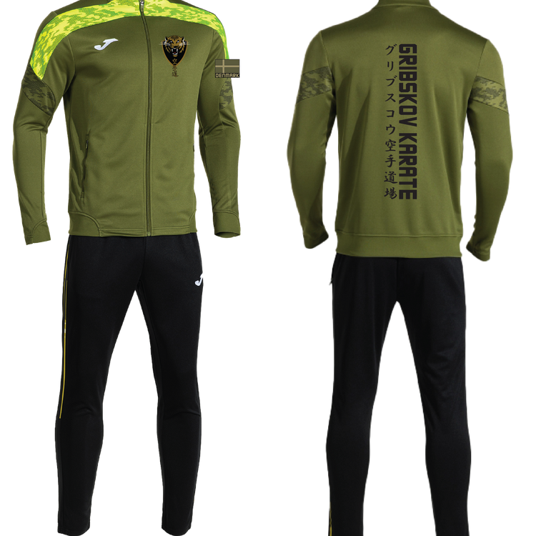 Joma Academy III træningsdragt i neongul med sort kontrast på bukseben og ærmer. Åben overdel med gennemgående lynlås samt ribkant ved taljen, hals samt ved håndled. Bukserne er slimfit med lommer uden lynlås. Joma logo med silketryk.